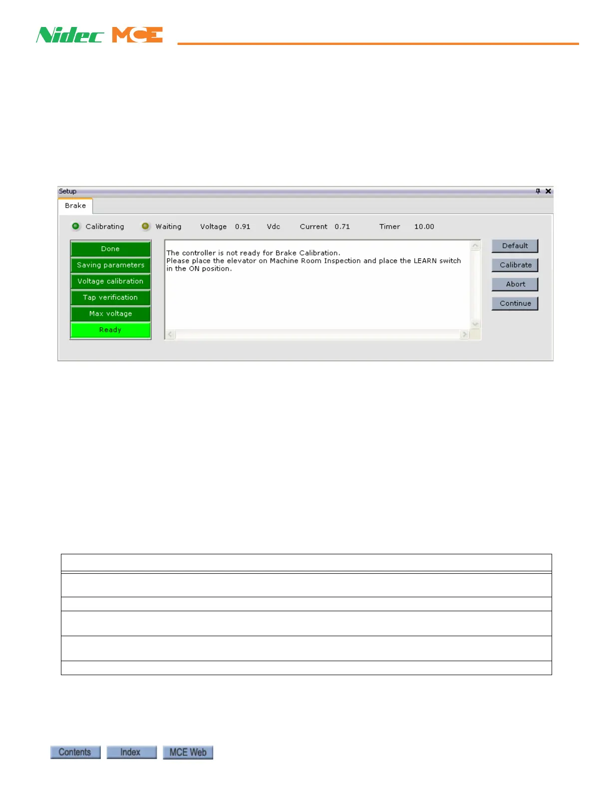 The controller is not ready for Brake Calibration. Please place the elevator on Machine Room Inspection and