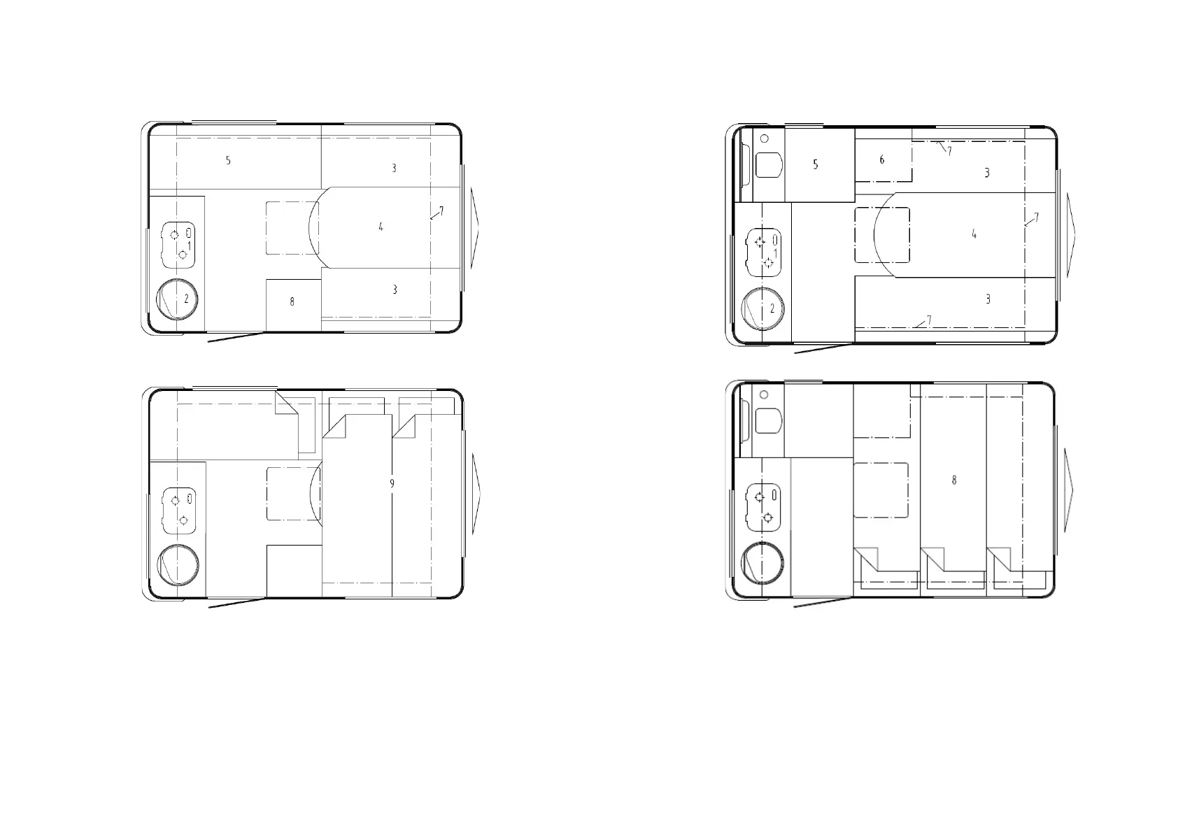 Fig. 5 Day layout (a) and night layout (b) of the N126ntl caravan (1 - gas stove,