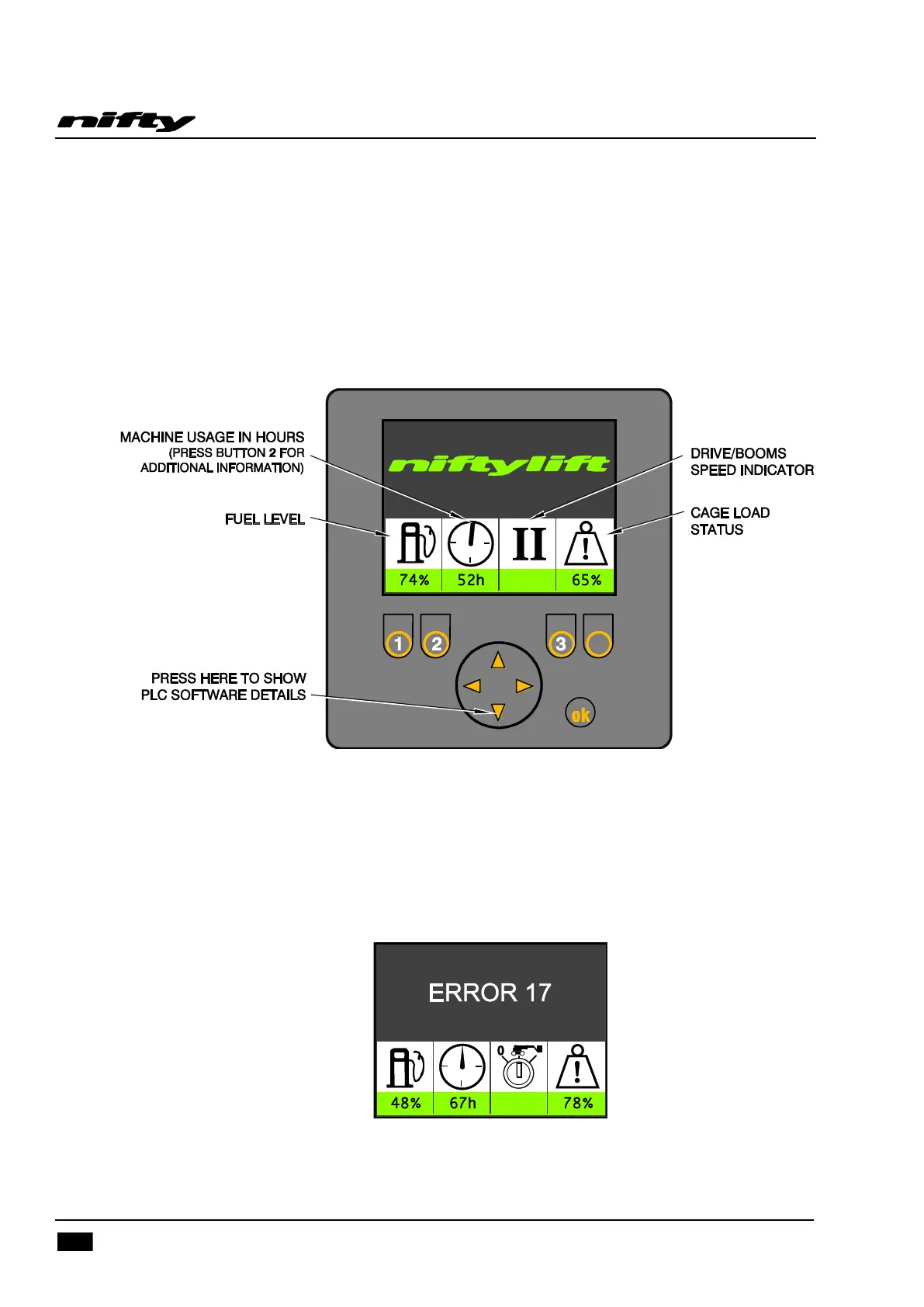 the gauge displays current fuel level, basket load status (if fitted), current boom/drive speed setting and