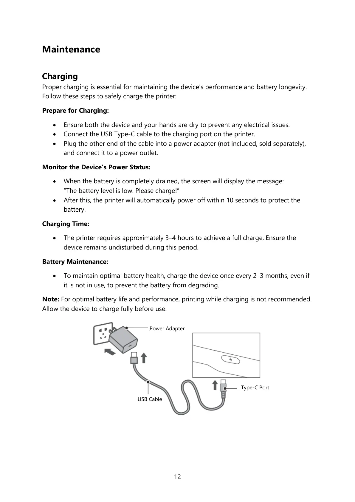 • The printer requires approximately 3–4 hours to achieve a full charge. Ensure the
