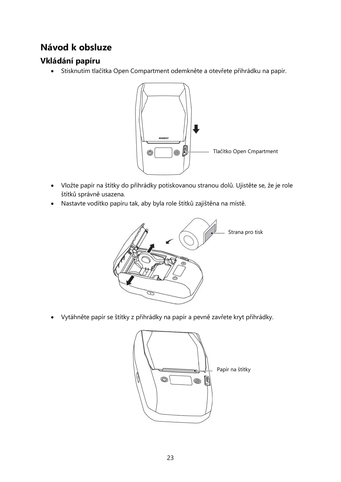 Vlte papír na štítky do přihrádky potiskovanou stranou dolů. Ujistěte se, že je role