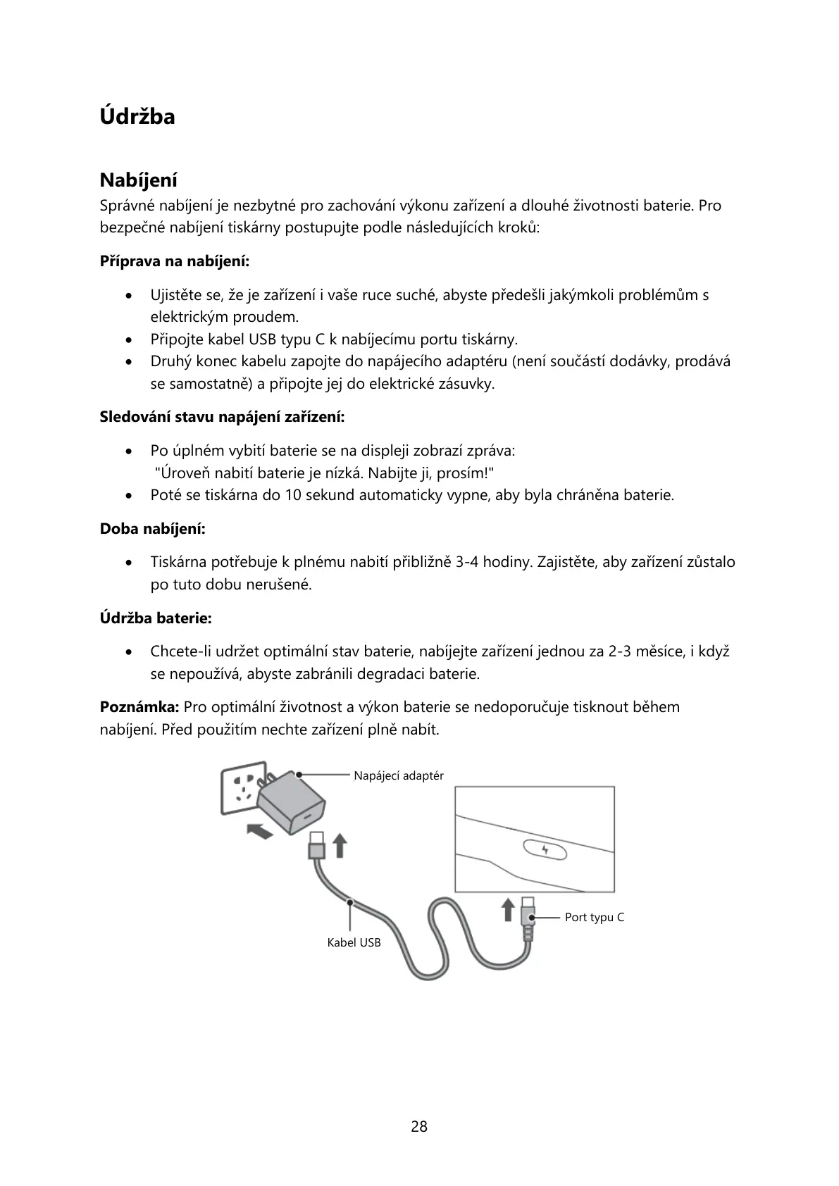 • Tiskárna potřebuje k plnému nabití přibližně 3-4 hodiny. Zajistěte, aby zařízení zůstalo