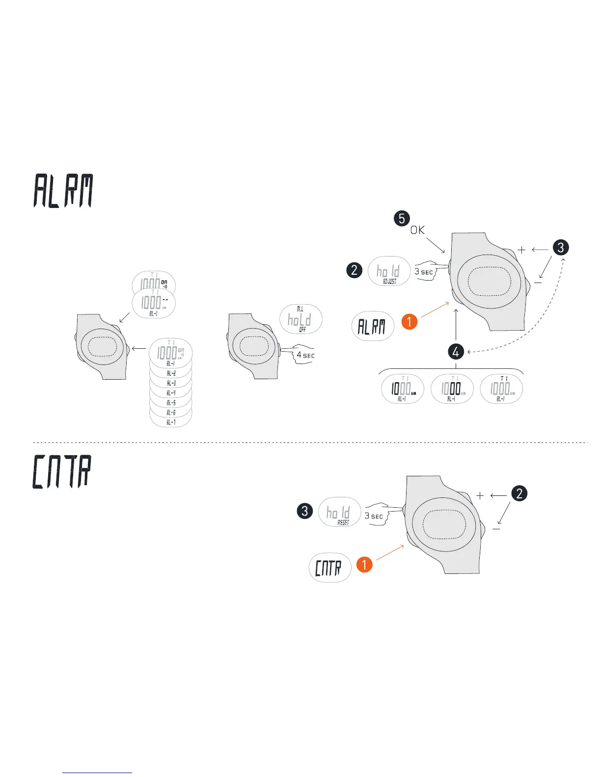 In ALARM mode you can set 7 alarms within 2 time zones.