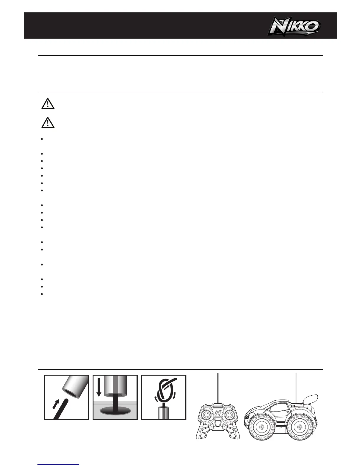• Remove batteries from R/C vehicle and controller if vehicle will not be used for a long period of time.