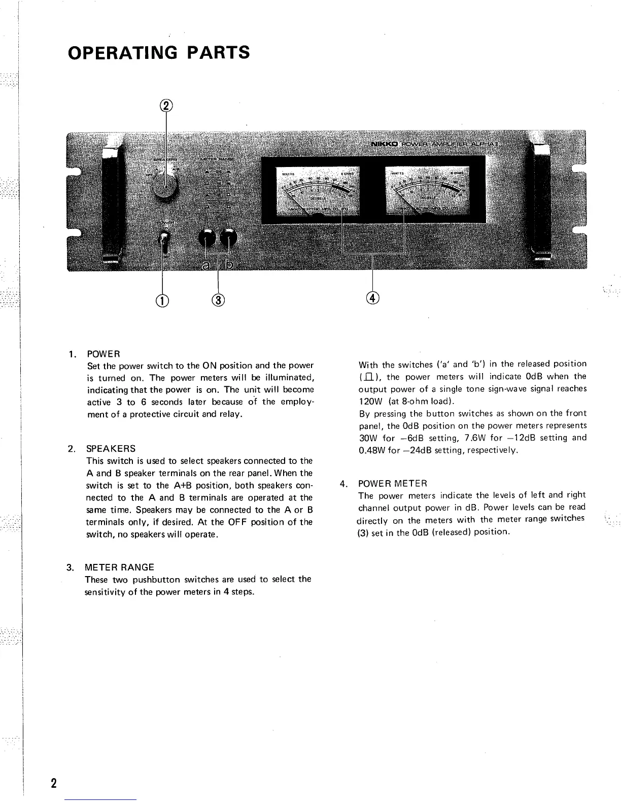 Nikko Alpha II - OPERATING PARTS; POWER; SPEAKERS; METER RANGE