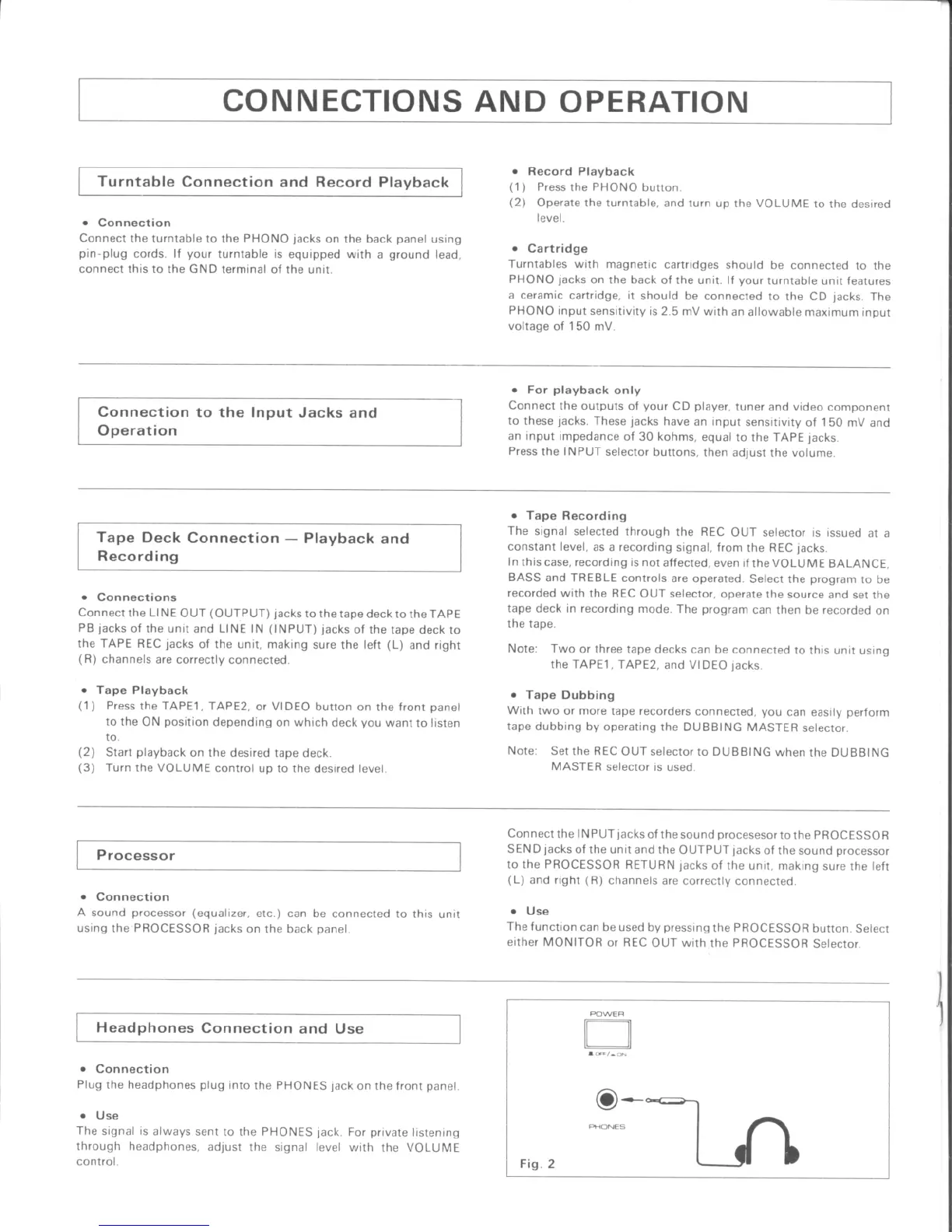 Nikko BETA400 - Connections and Operation; Turntable Connection and Record Playback; Tape Deck Connection; Processor