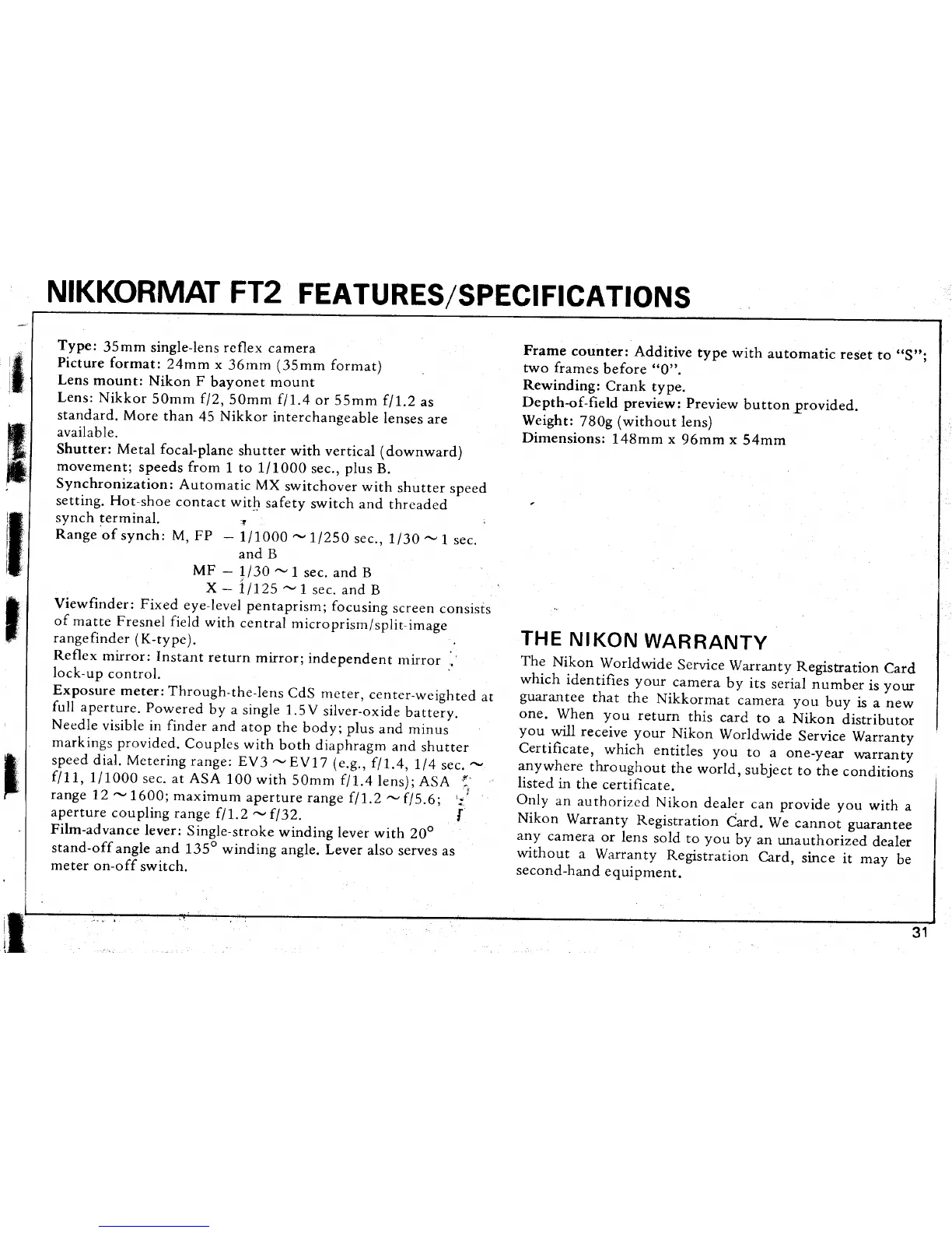 NIKKORMAT FT2 - NIKKORMAT FT2 FEATURES;SPECIFICATIONS; THE NIKON WARRANTY