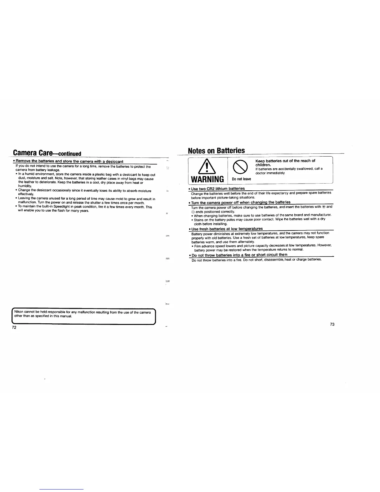 Nikon 2170749 - Pronea S APS Camera - Miscellaneous Camera Information; Camera Care and Storage; Notes on Batteries