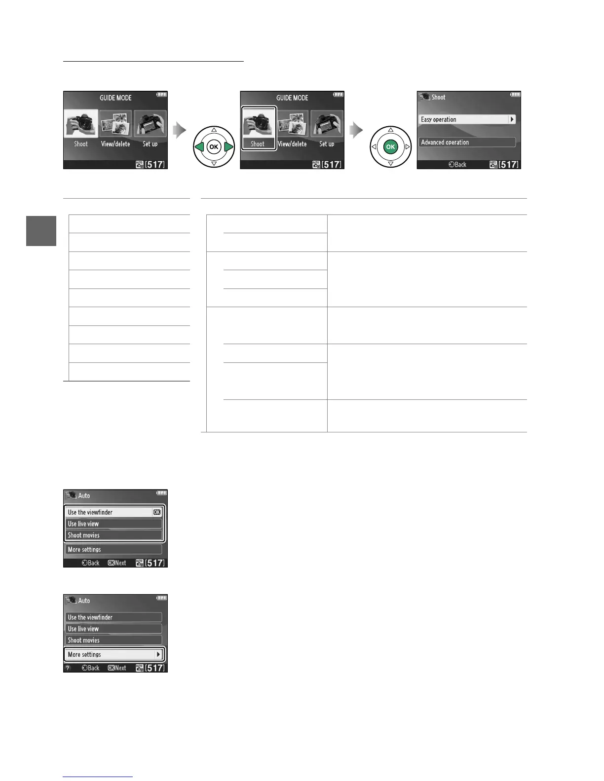 To access these menus, highlight Shoot, View/delete, or Set up and press J.