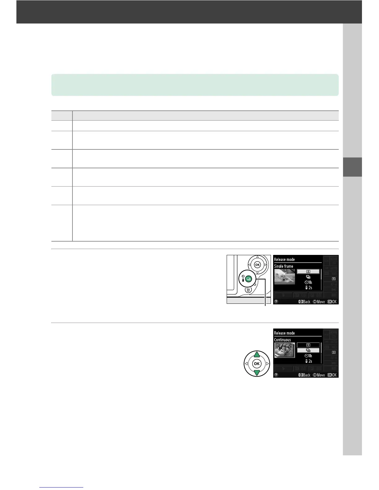 Single frame: Camera takes one photograph each time shutter-release button is pressed.