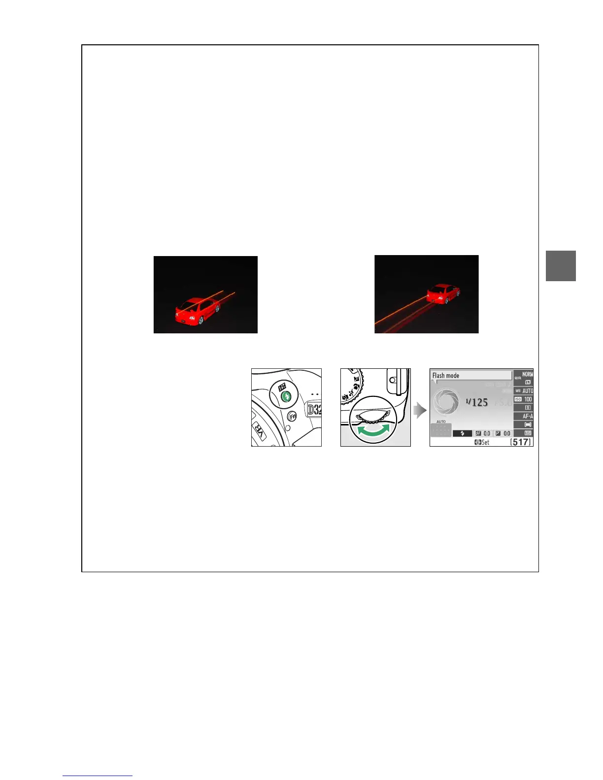 • REAR (rear-curtain sync): Flash fires just before shutter closes, creating a stream of light behind
