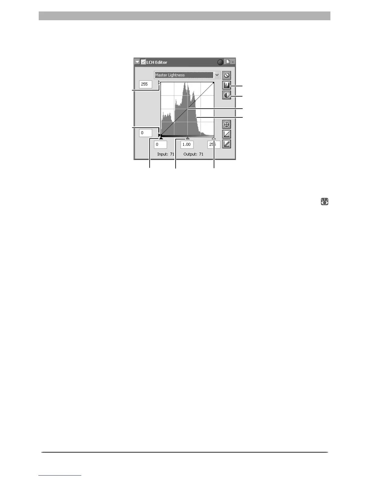 Mid-point slider: Set the mid-point (gamma value). Moving the mid-point alters the bright-