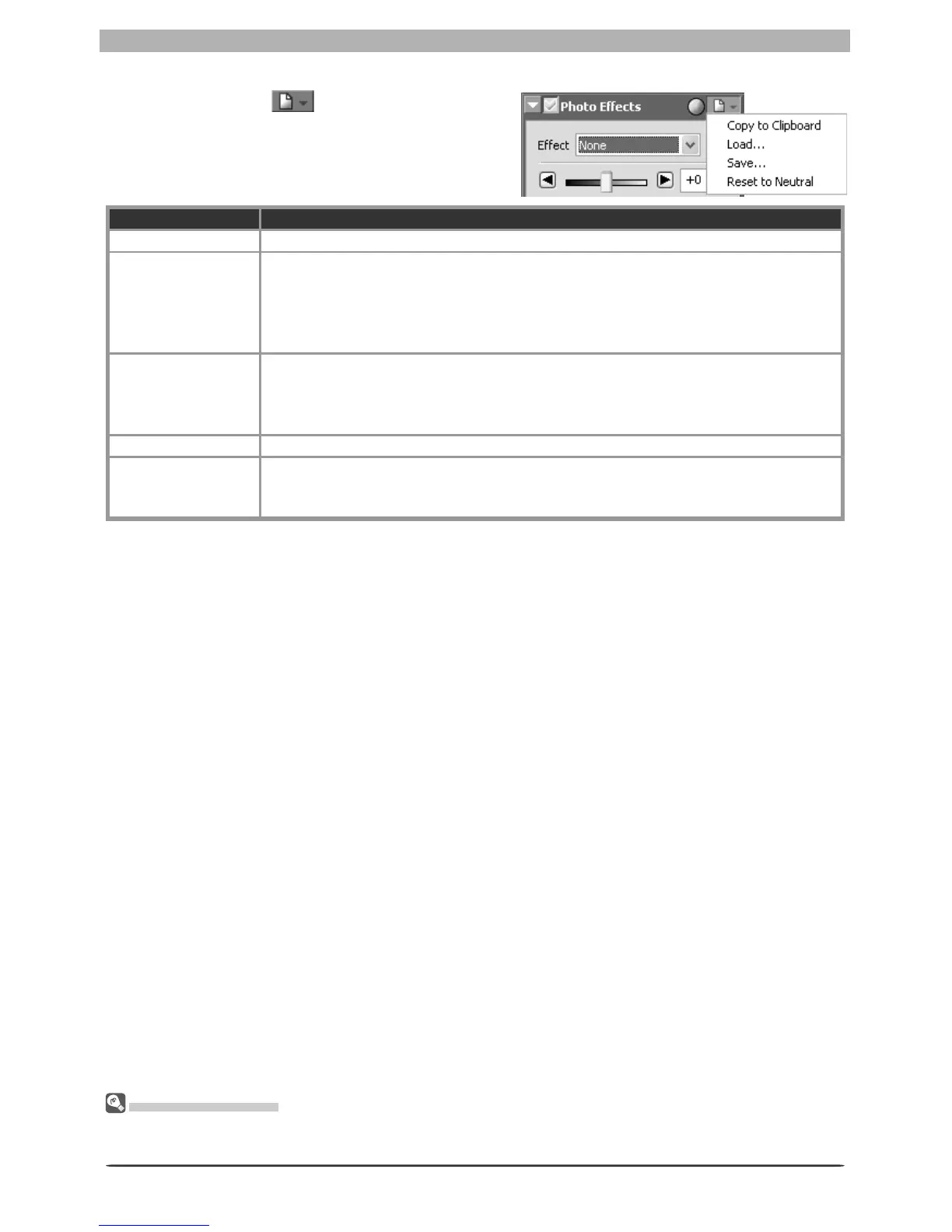 Copy to Clip board Copy current Photo Effects settings to the clipboard.