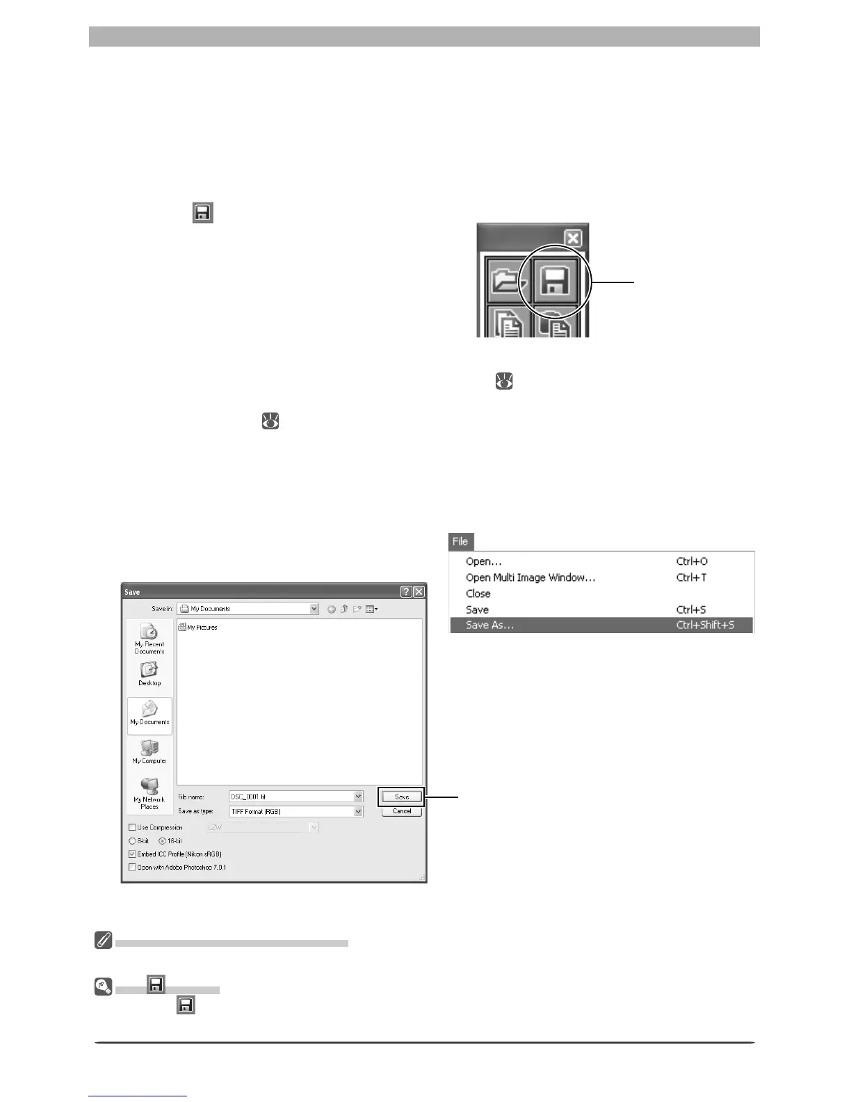 Nikon Capture offers two options for saving fi les: Save and Save as…. The Save option saves