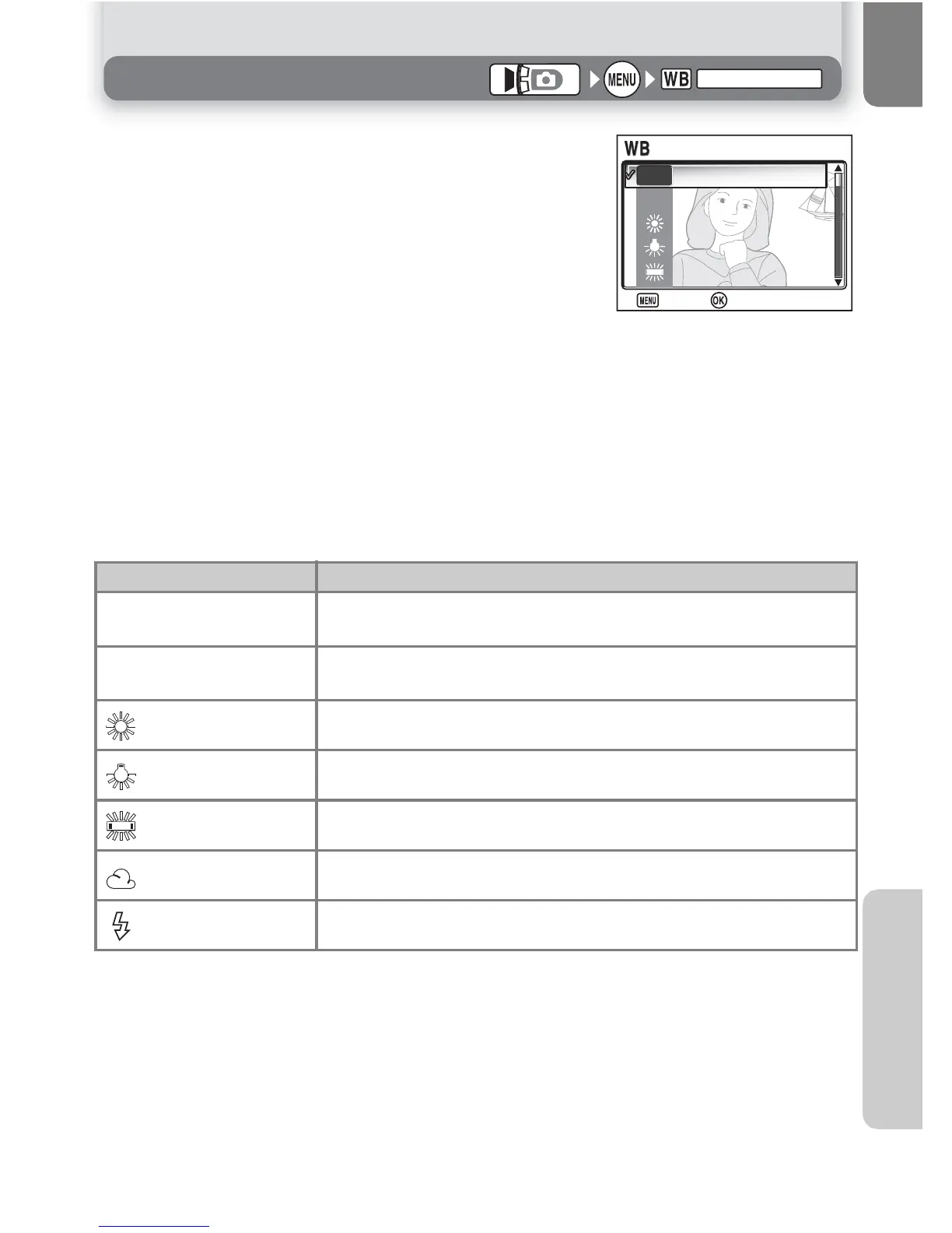 • If you cannot achieve the desired white balance with Auto (M) or you want to