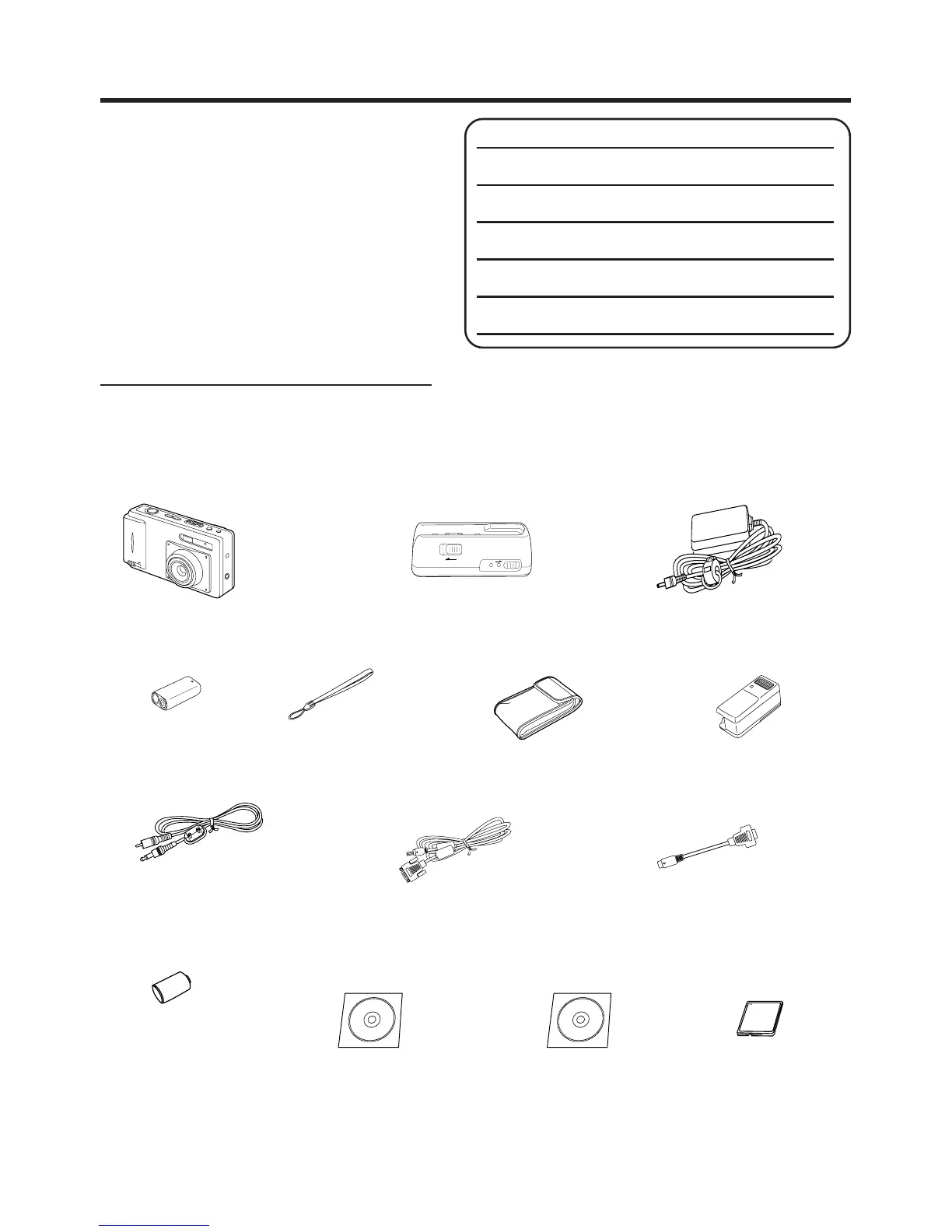 Please confirm that the following items are packed in the Digital Camera box. They are