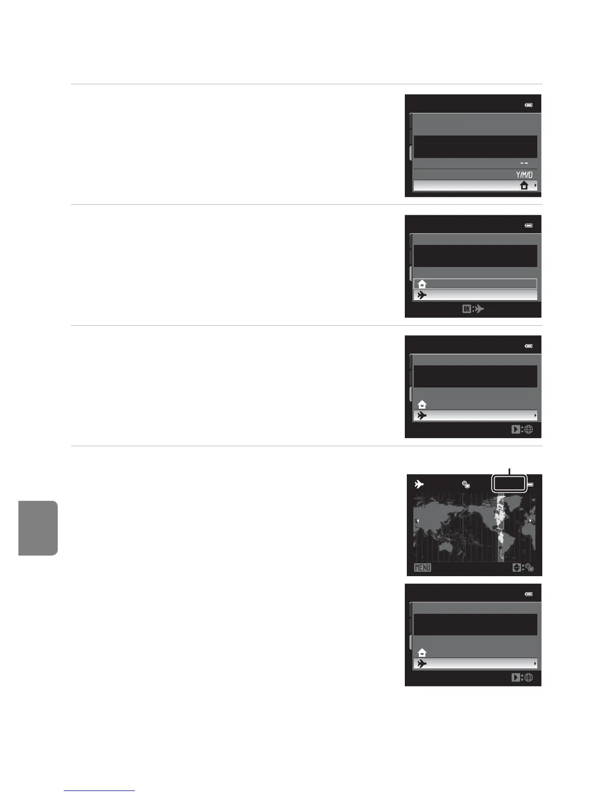 • To switch to the home time zone, choose w Home time zone in step 2 and press the k button.