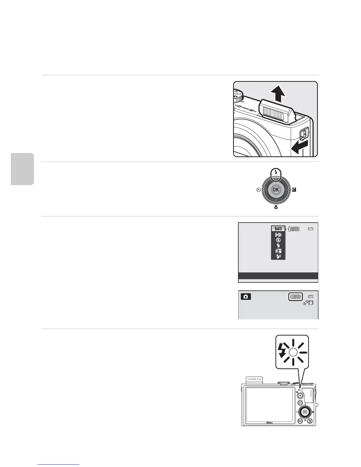 You can shoot pictures with a flash by raising the flash. You can set a flash mode that