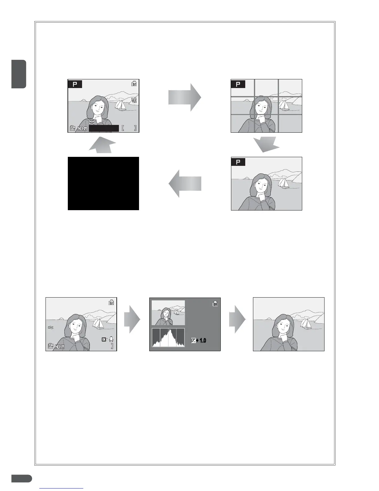 • Modo de exposición: P, S, A o M (B 38). P también se muestra para aquellas fotografías que