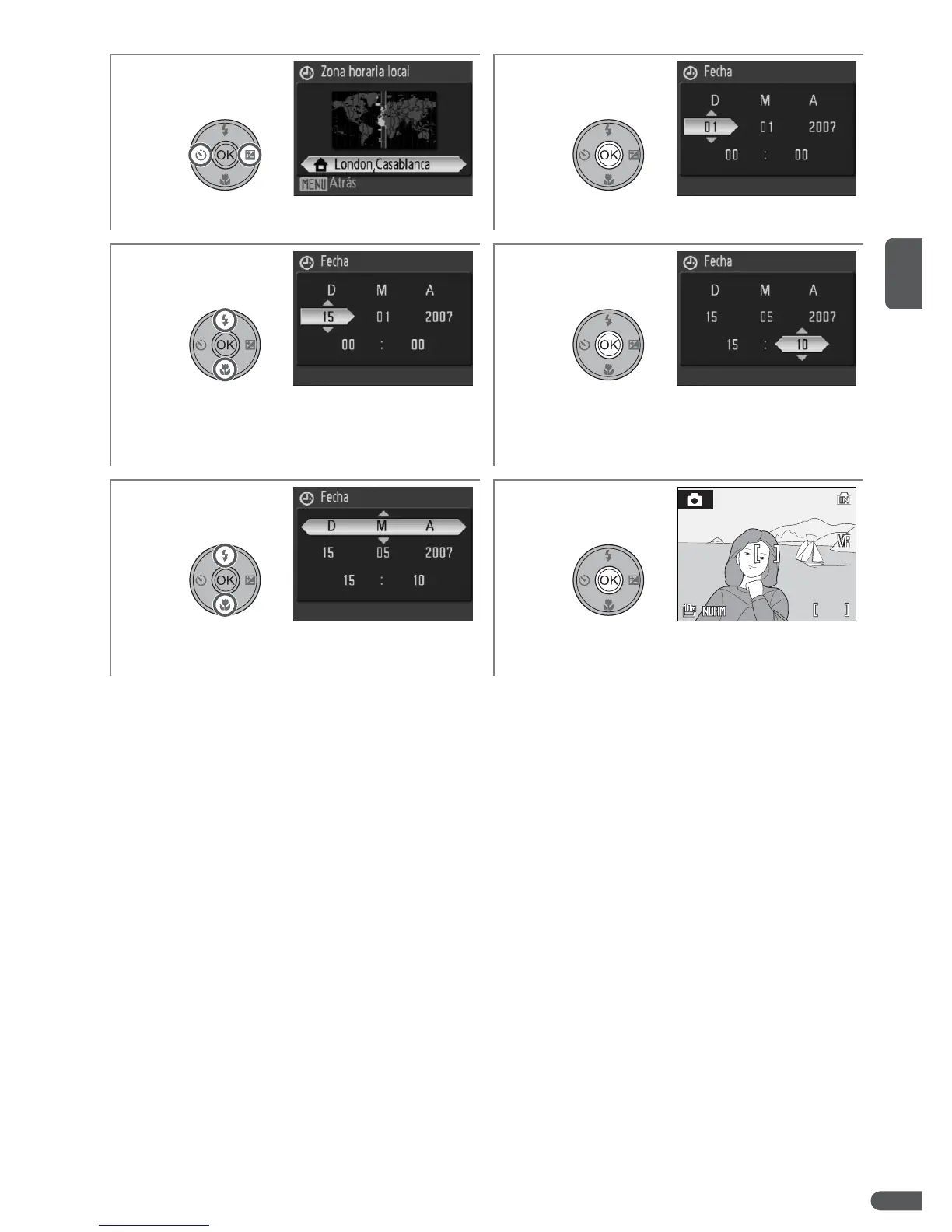 Elija el orden de visualización de la fecha. Ajuste el reloj y salga al modo de