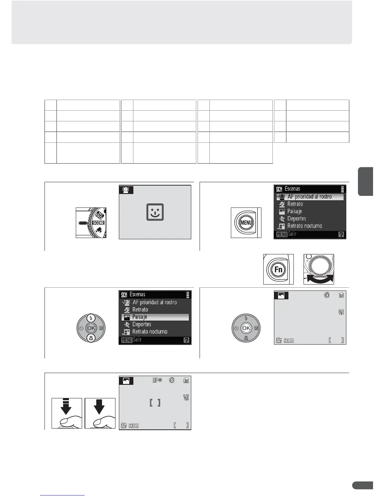 La cámara permite elegir entre dieciséis tipos de escenas. Los ajustes de la