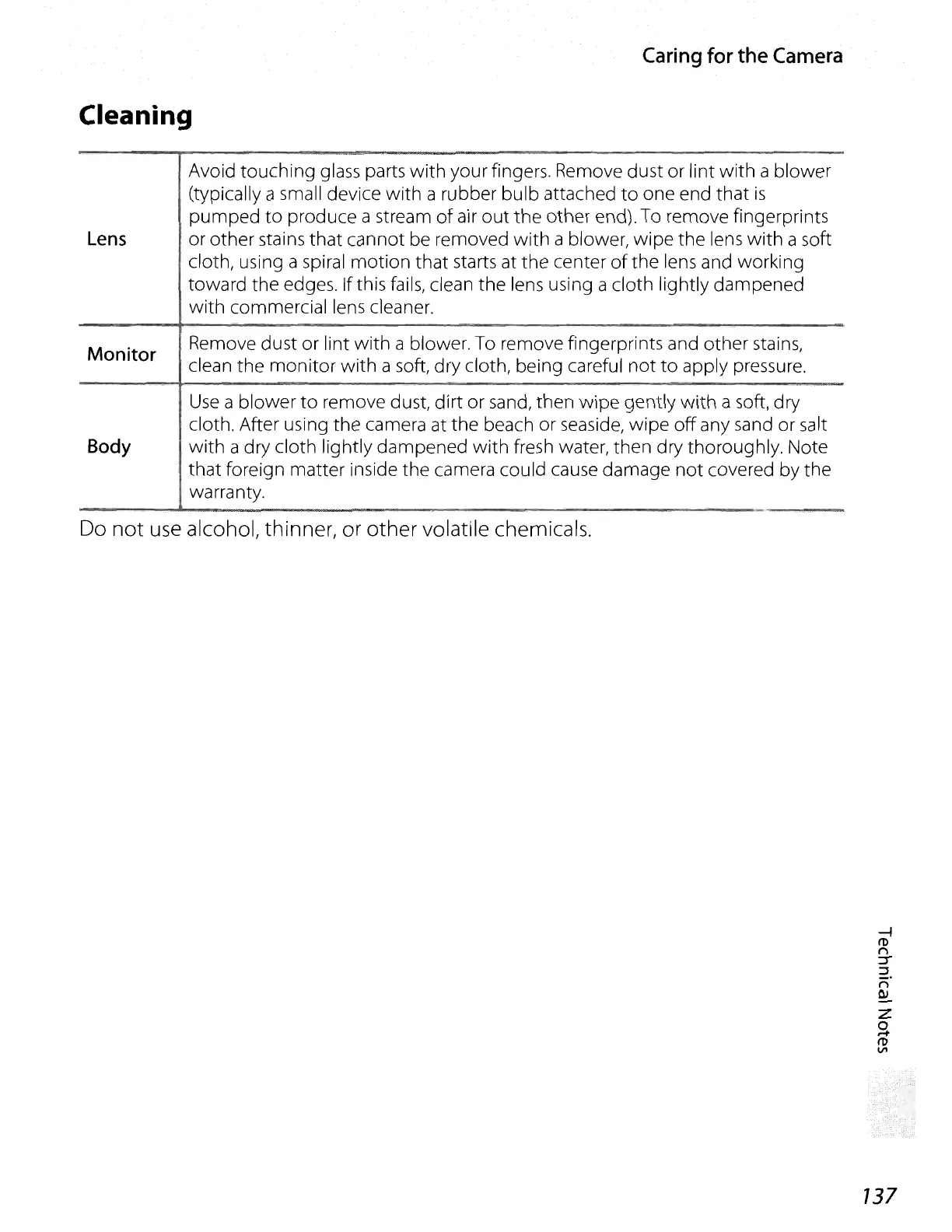 alcohol, thinner, or other volatile chemicals.