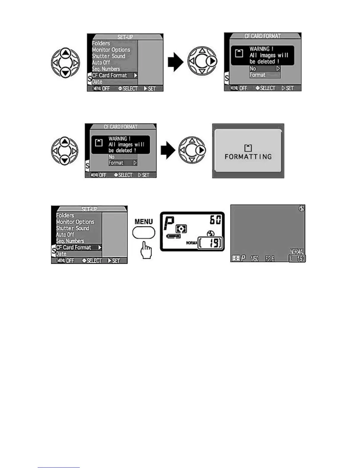 stopped. Formatting permanently deletes all the data recorded on the CF memory card. Do not remove the CF memory card