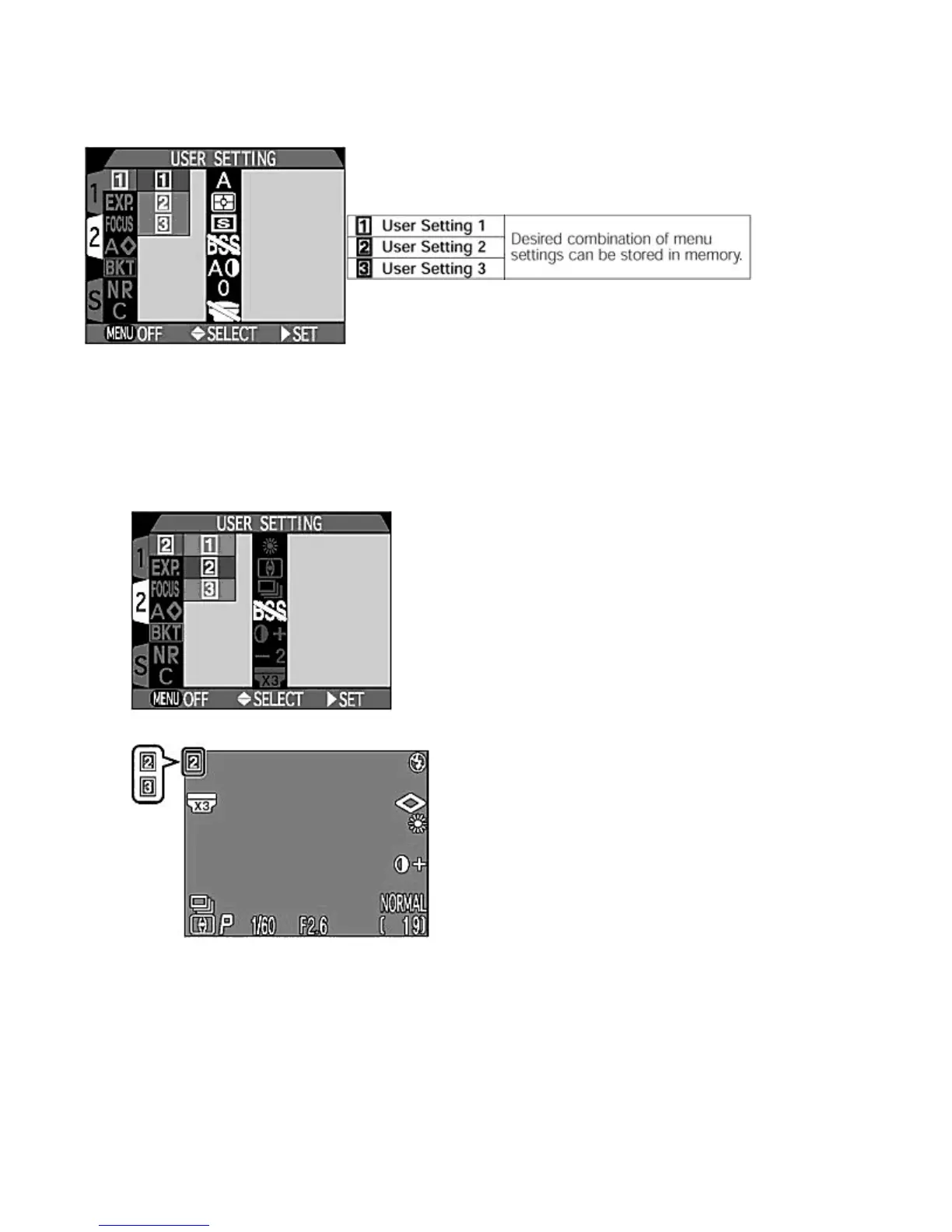 To store the desired settings in User Setting 2 or 3, highlight 2 or 3 by pressing UP