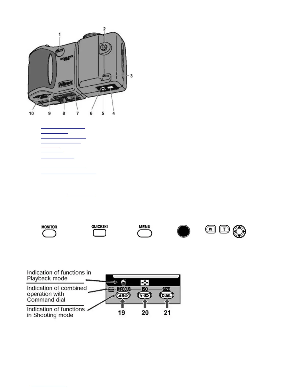 Functions of buttons 19, 20 and 21 differ in Shooting mode and Playback mode; these buttons are indicated as follows