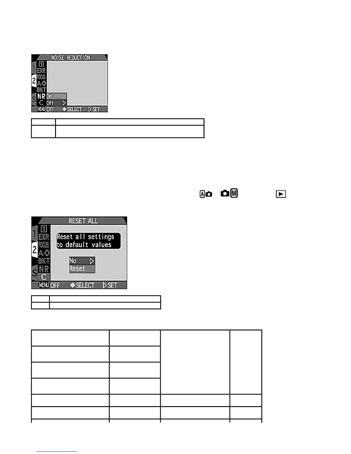 , the camera settings are reset to the defaults shown below: