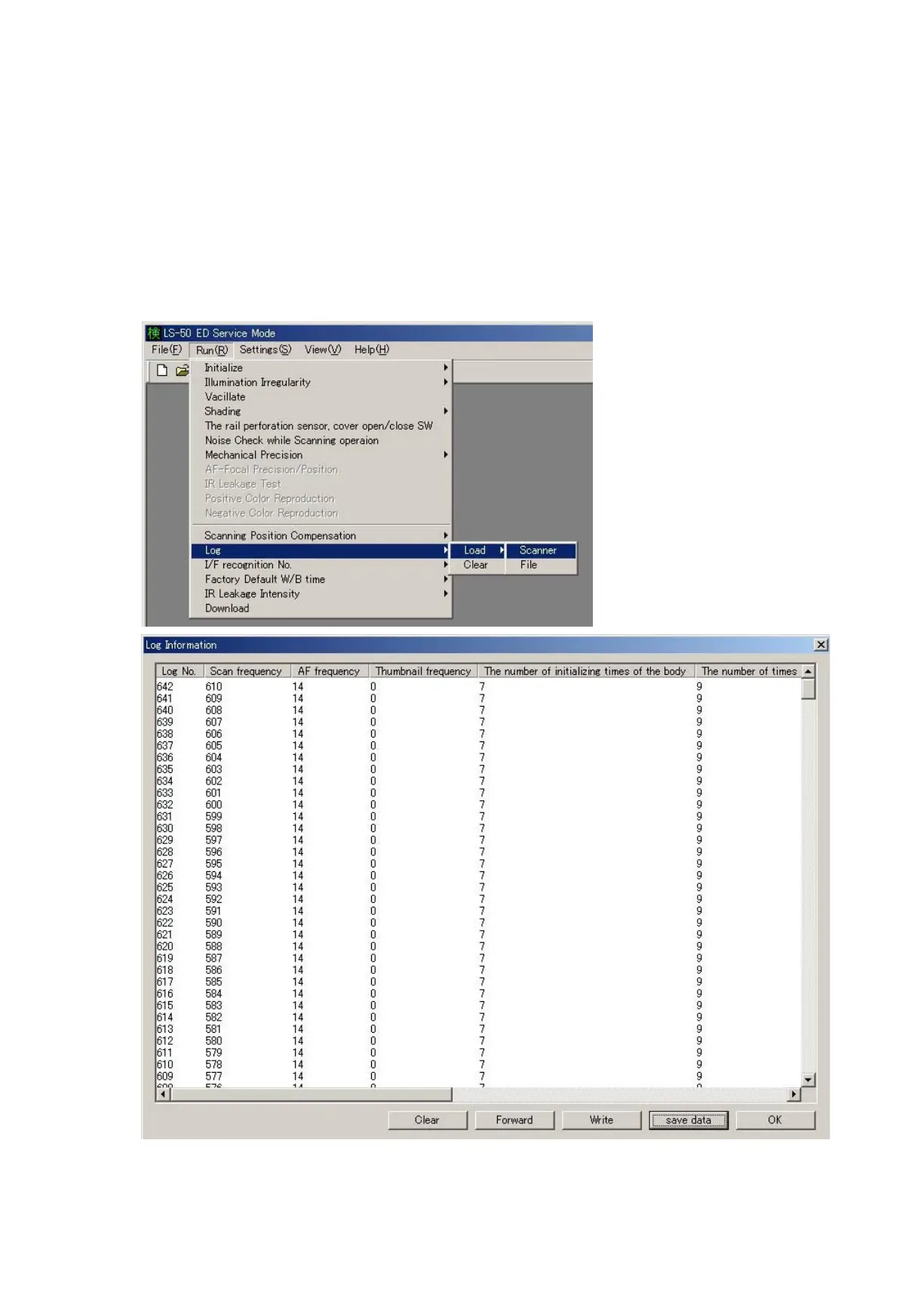 ・When "Run", "Log" and "Clear" are selected, the log data in the ash memory on the main PCB is cleared.