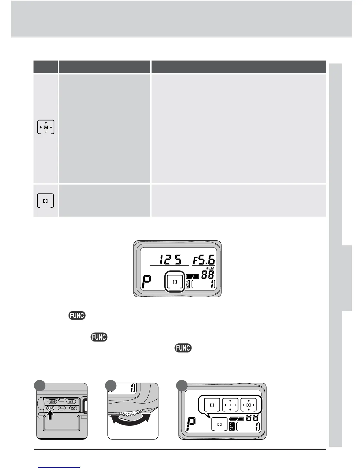 When AF Area is chosen in the Assign FUNC sub-menu, AF-area mode will be