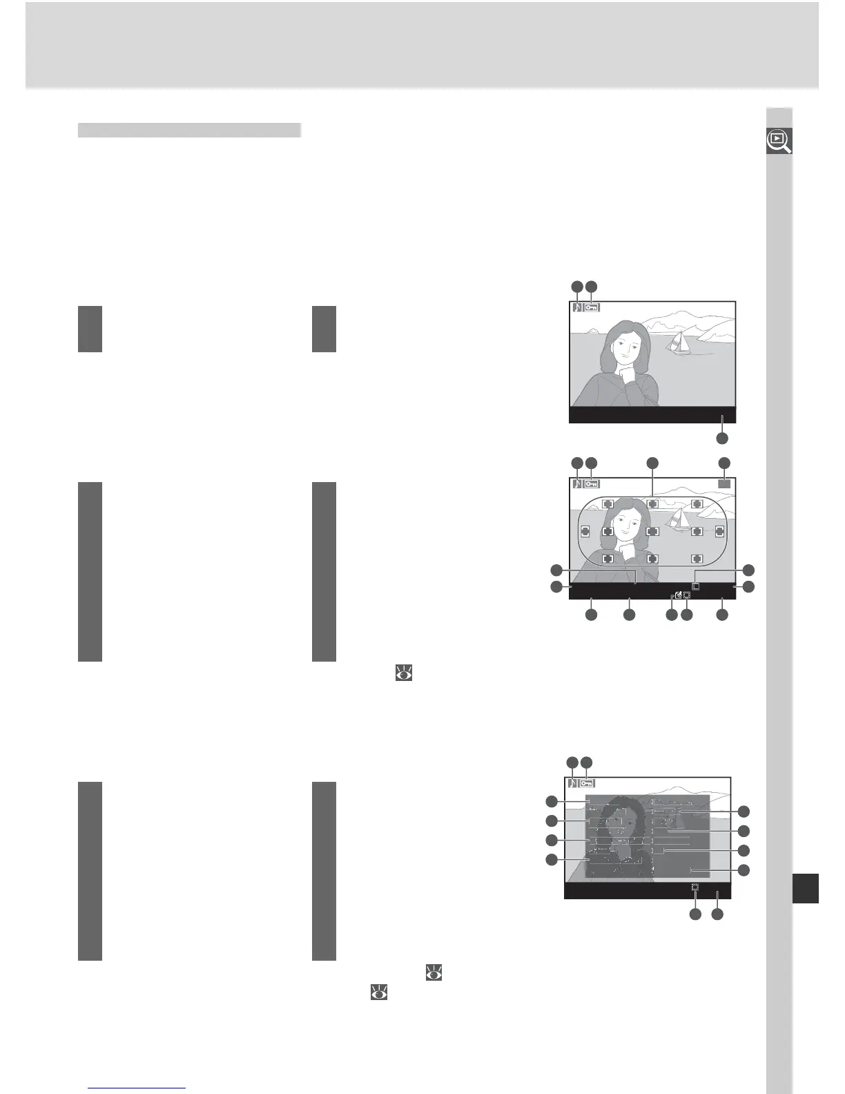 play back. There are up to eight pag es of in for ma tion for each pho to. Press