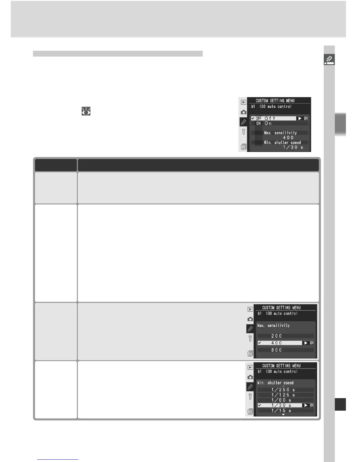 If On is selected for this option, the cam era will au to mat i cal ly adjust ISO sen-