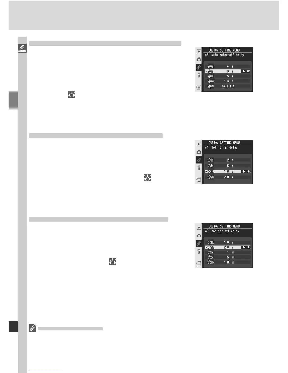 options chosen for Custom Settings c3 (Auto meter-off) and c5 (Monitor off).