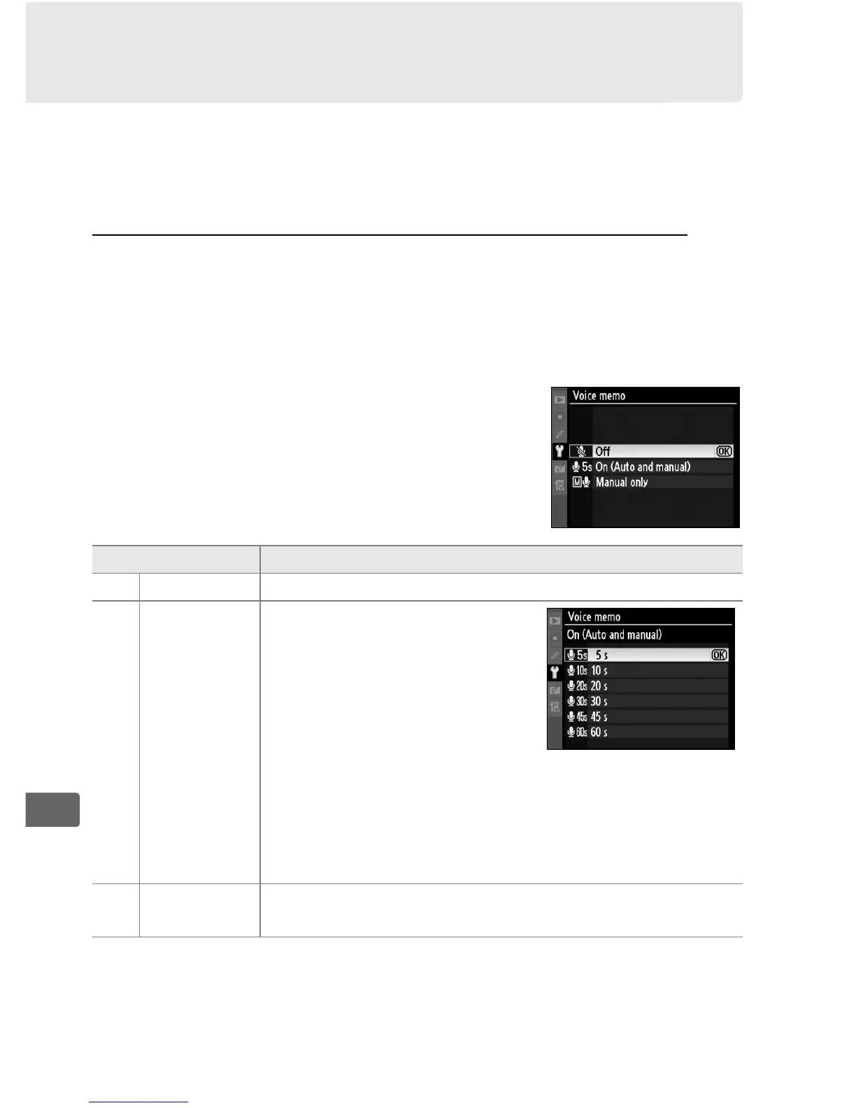Y Off (default) Voice memos can not be recorded in shooting mode.