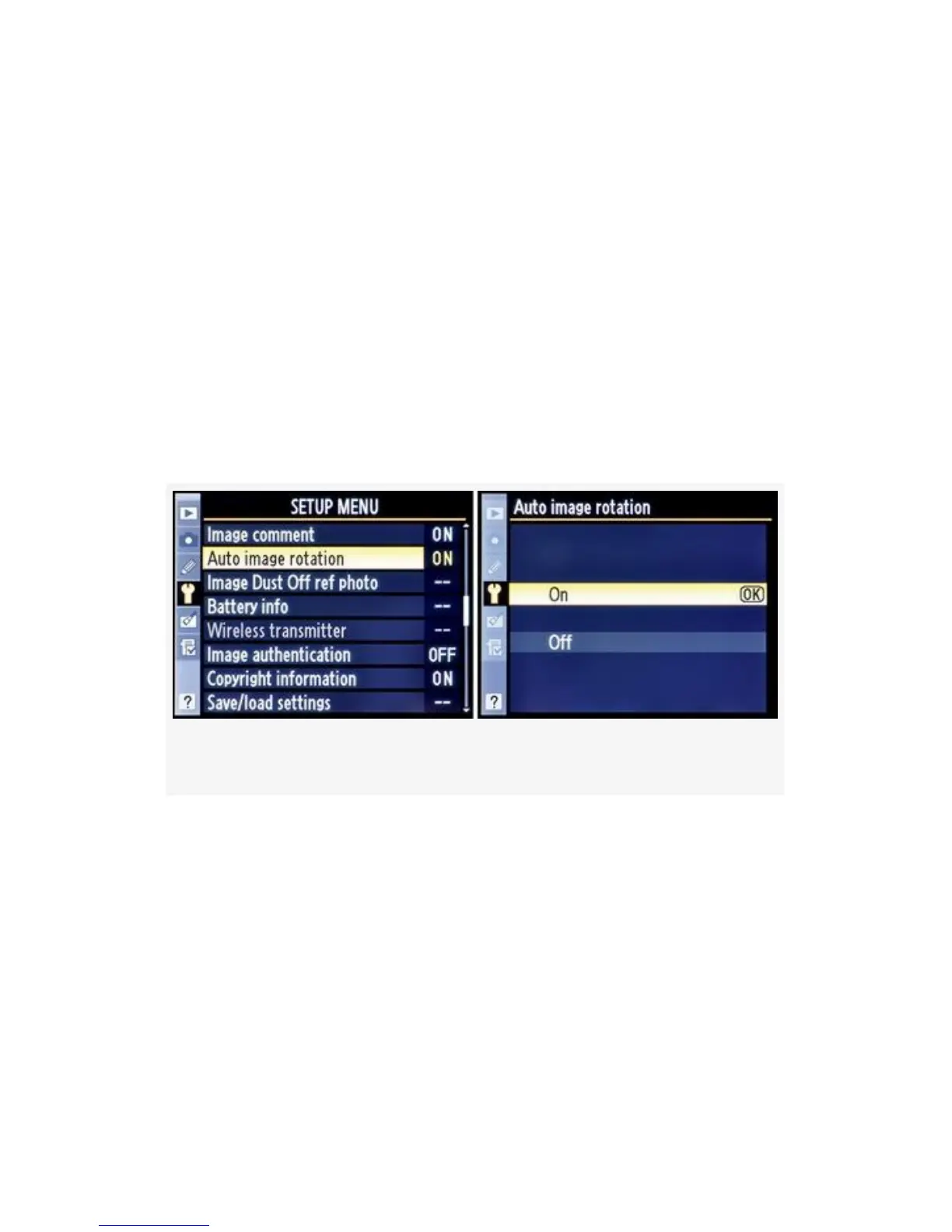1. Select Auto image rotation from the Setup Menu and