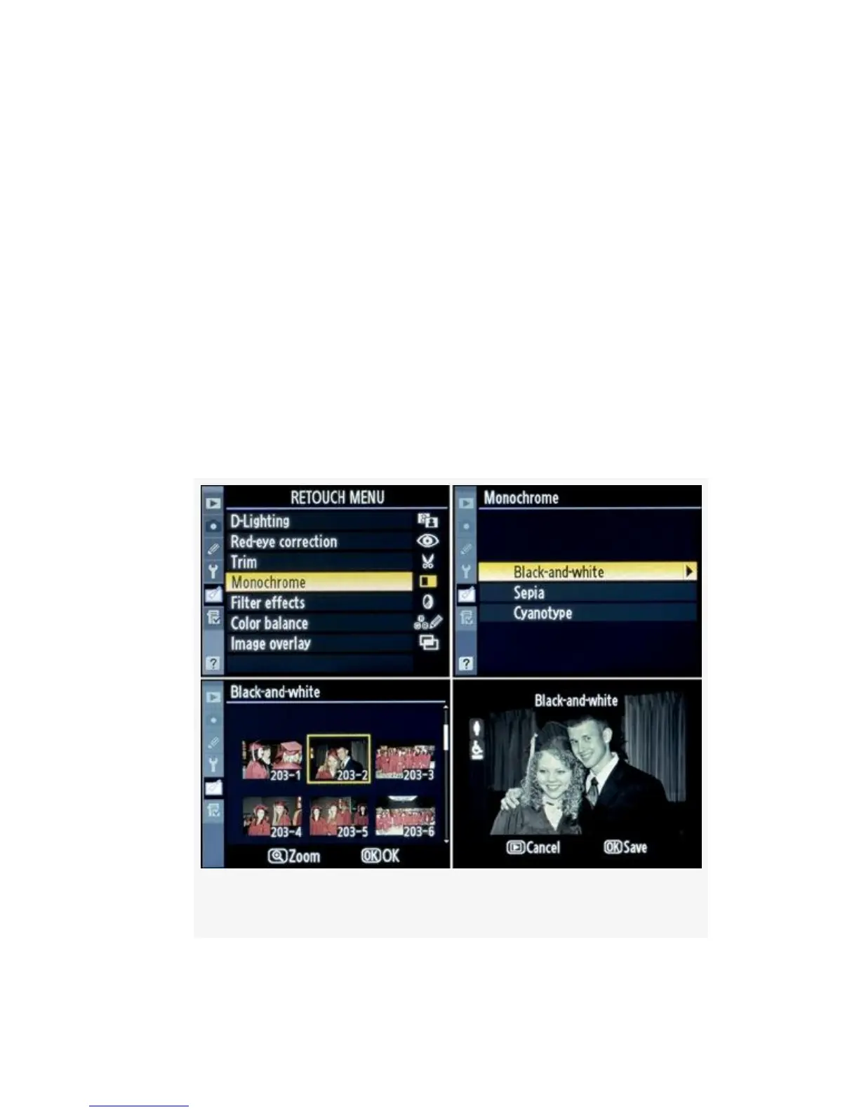 1. Select Monochrome from the Retouch Menu and scroll