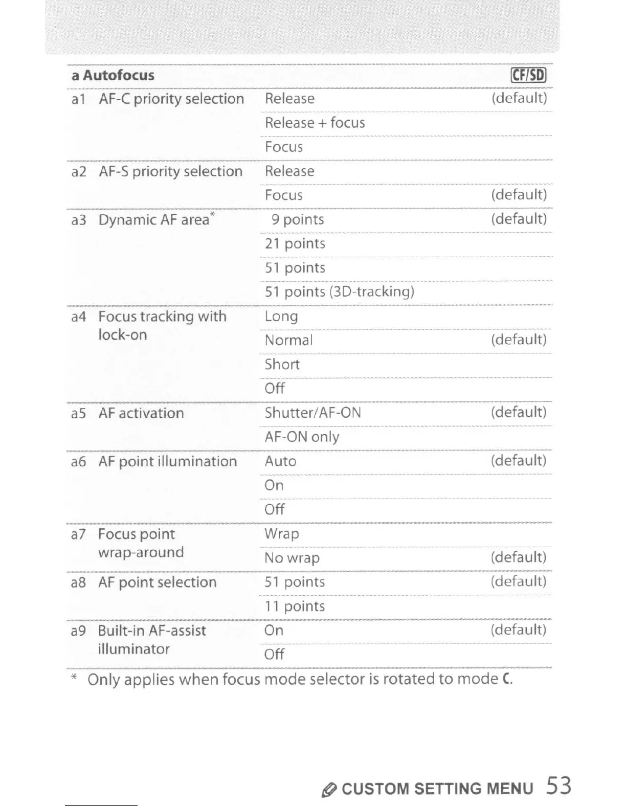 * Only applies when focus mode selector