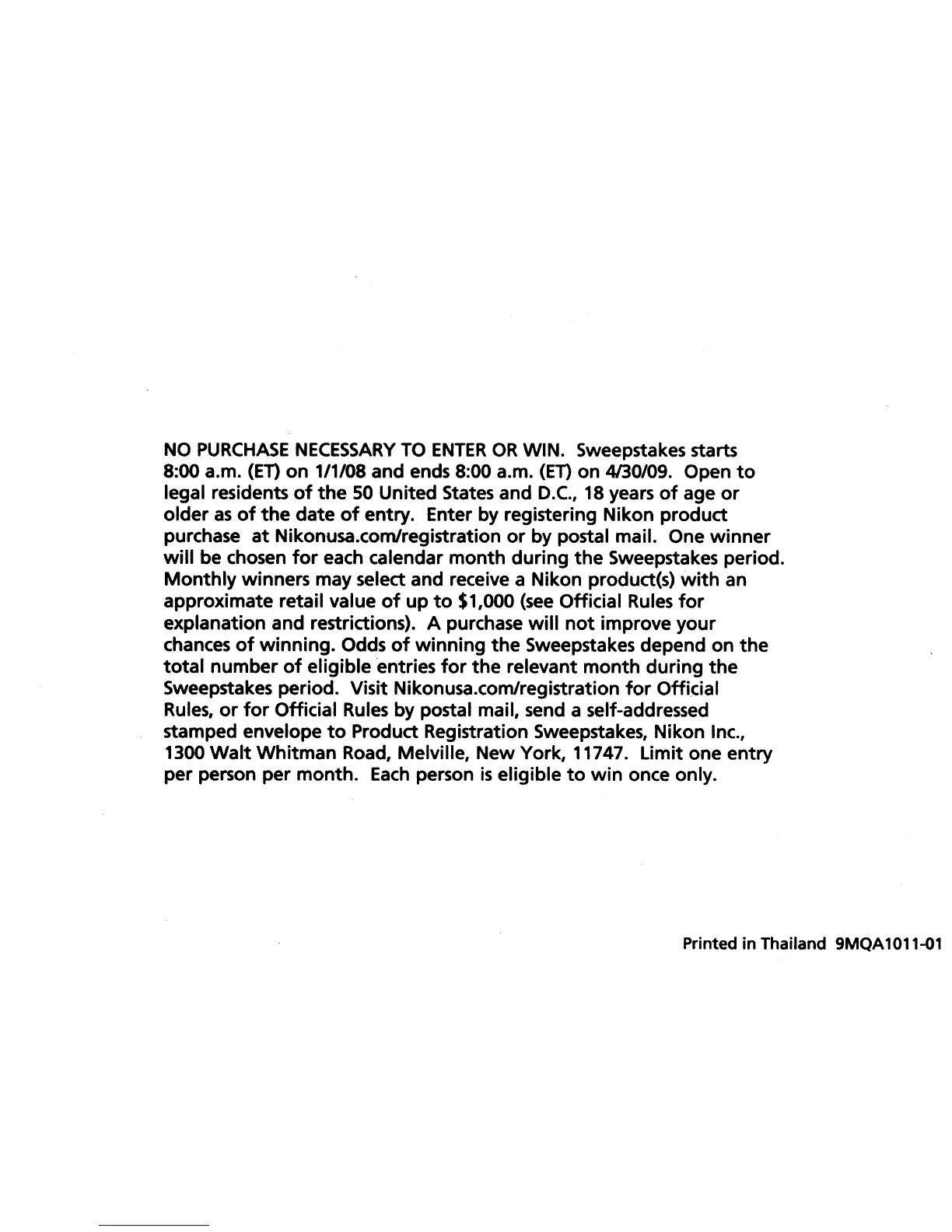 Product Registration Sweepstakes, Nikon Inc.,