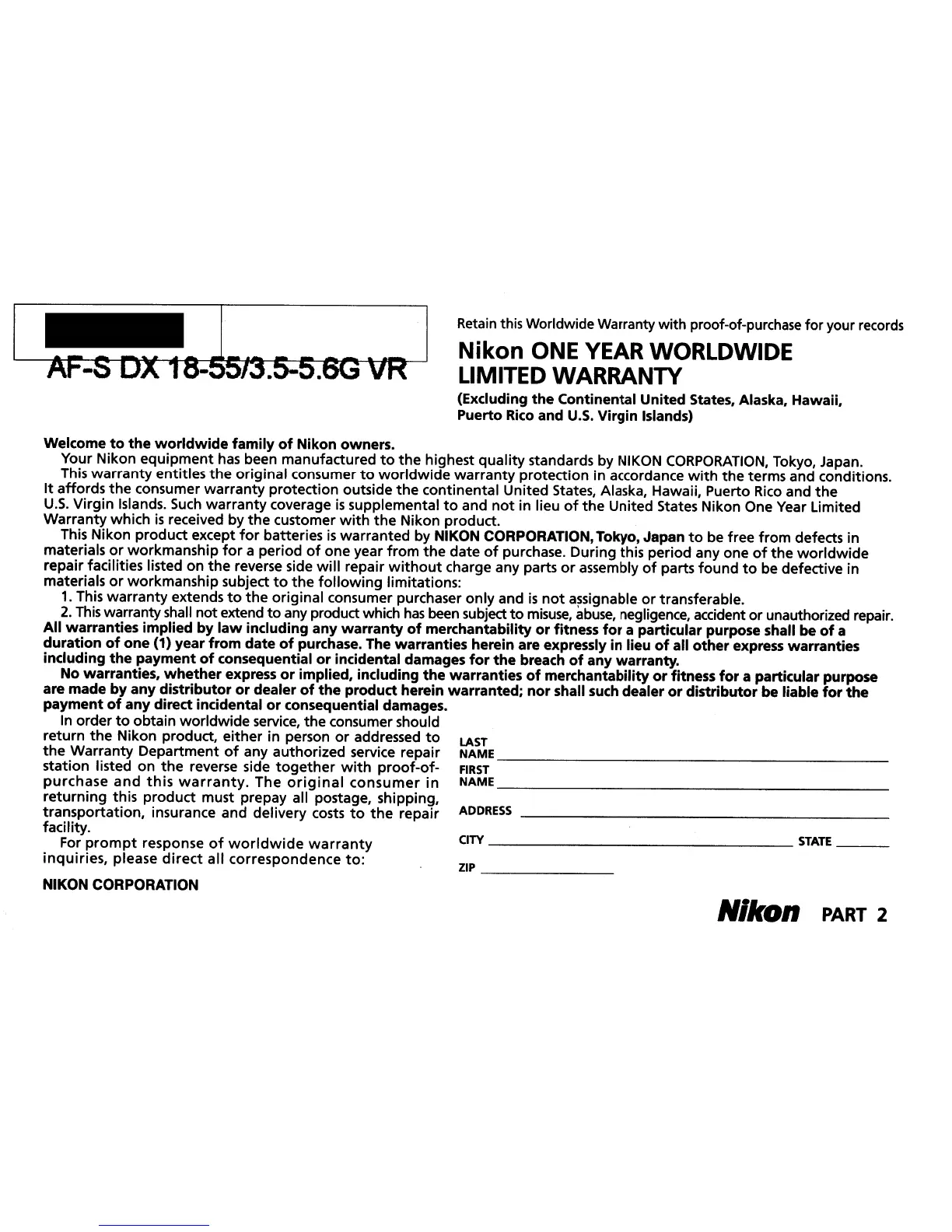 warranted by NIKON CORPORATION, Tokyo, Japan