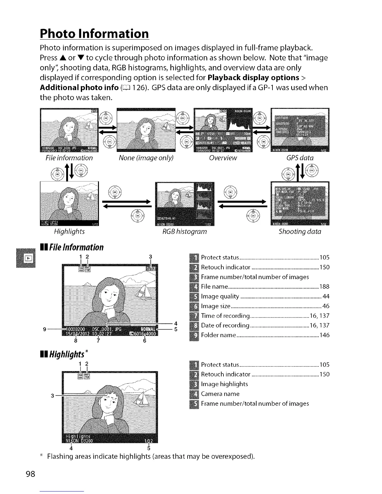 only'; shooting data, RGB histograms, highlights, and overview data are only