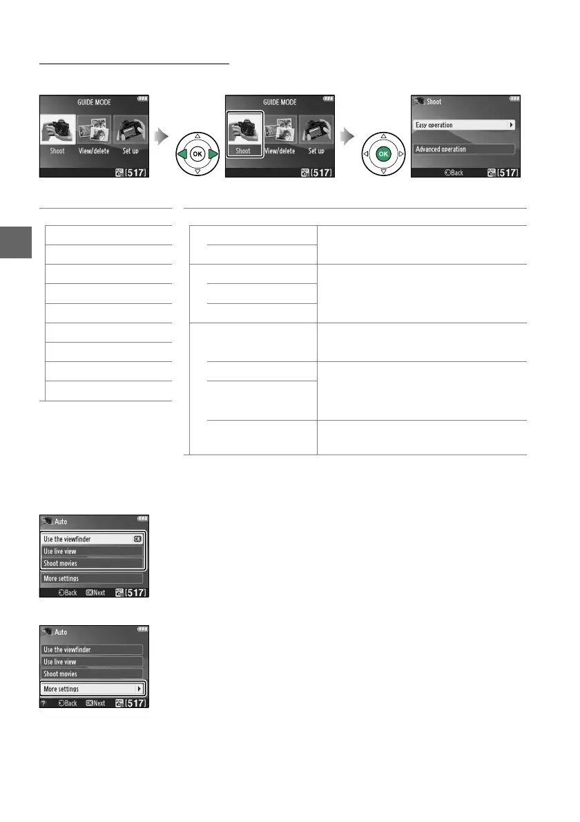 To access these menus, highlight Shoot, View/delete, or Set up and press J.
