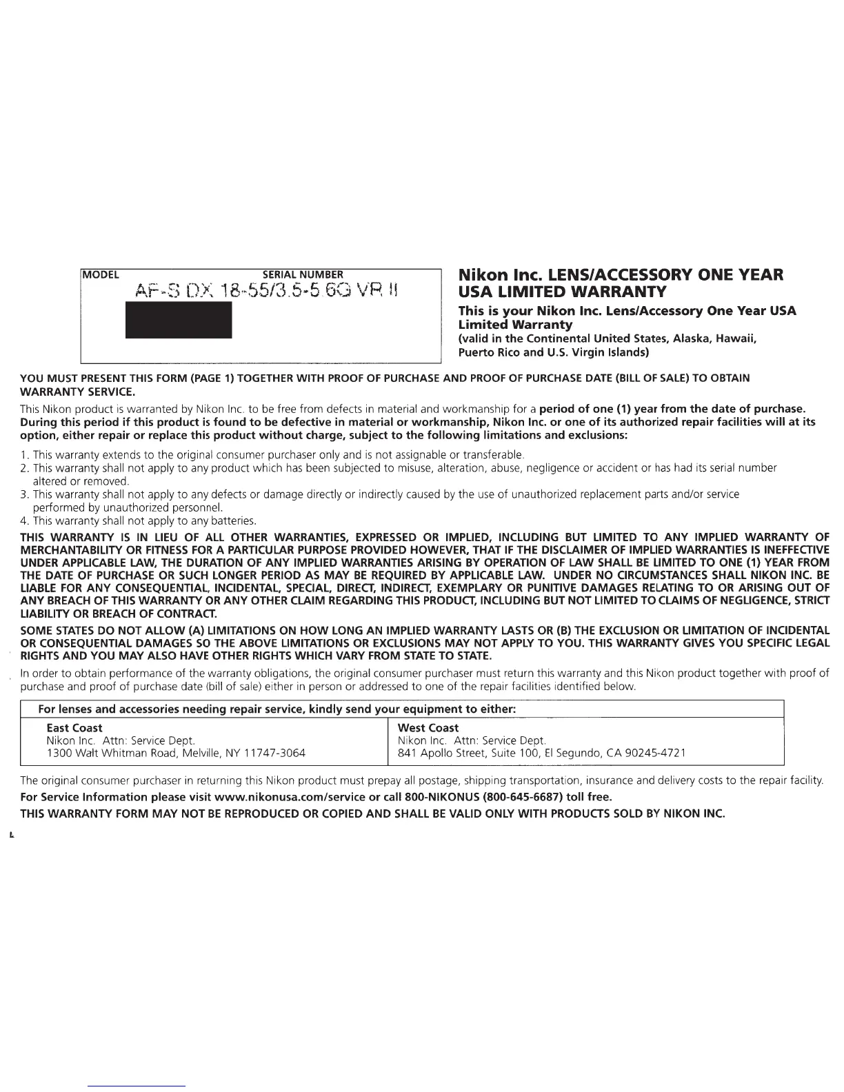 the warranty obligations, the original consumer purchaser must return this warranty and this Nikon product together
