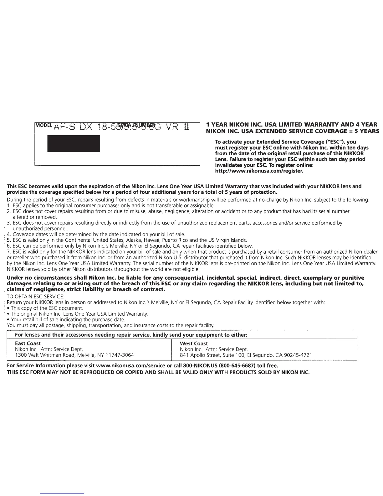 NIKON INC. USA EXTENDED SERVICE COVERAGE = 5 YEARS