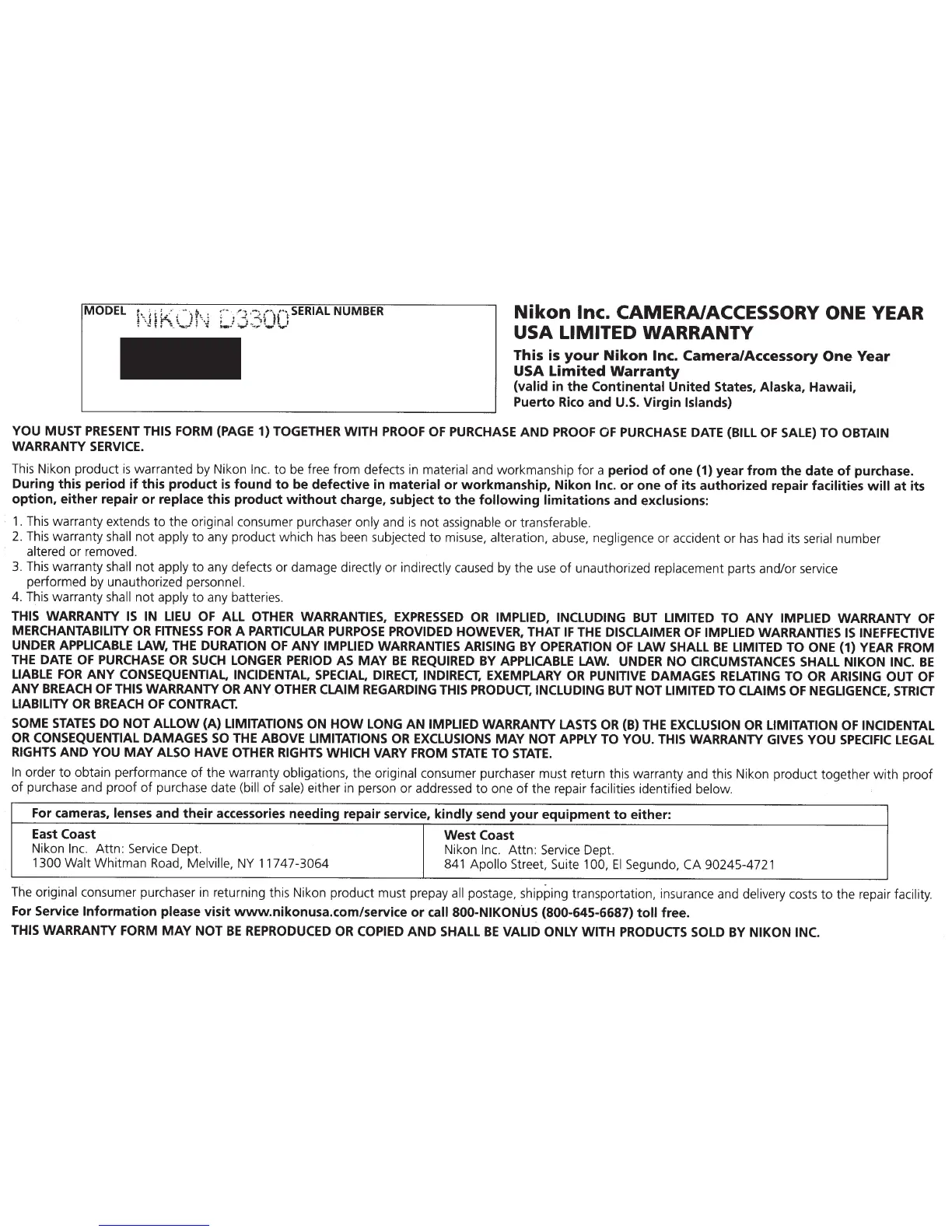 the warranty obligations, the original consumer purchaser must return this warranty and this Nikon product together with proof