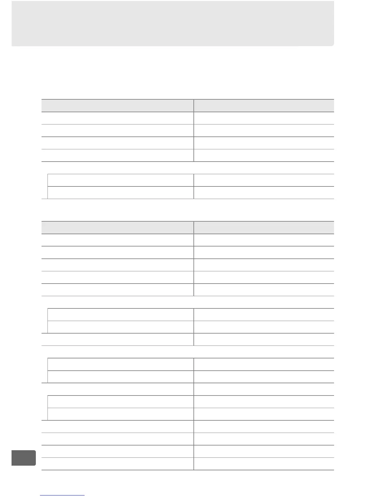 The default settings for the options in the camera menus are listed