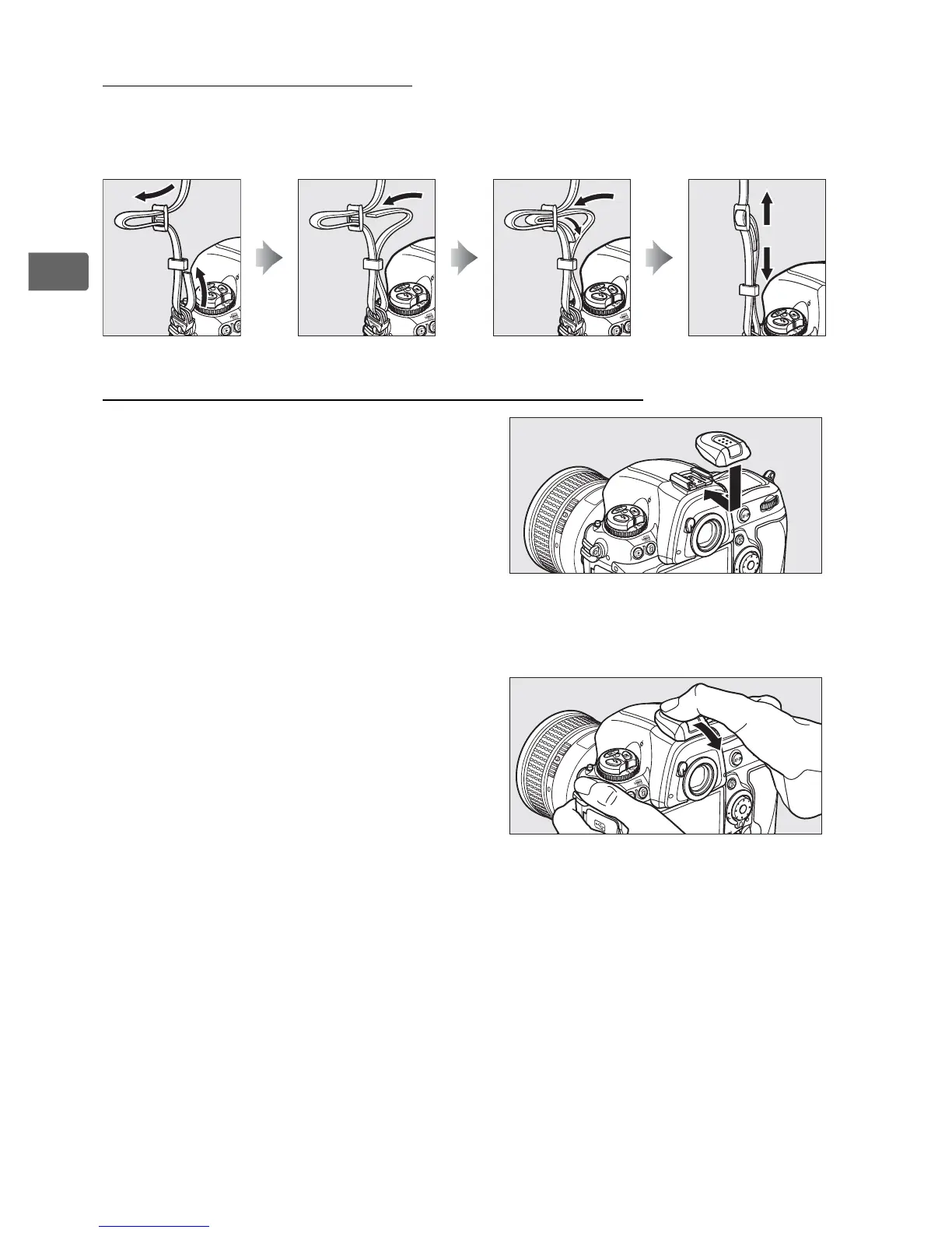 Attach the camera strap securely to the two eyelets on the camera