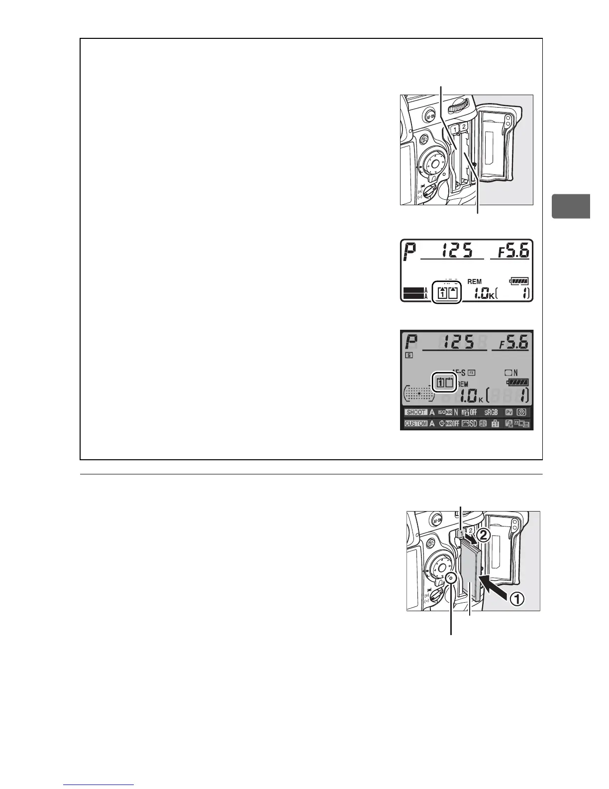 Insert the first memory card in slot 1.