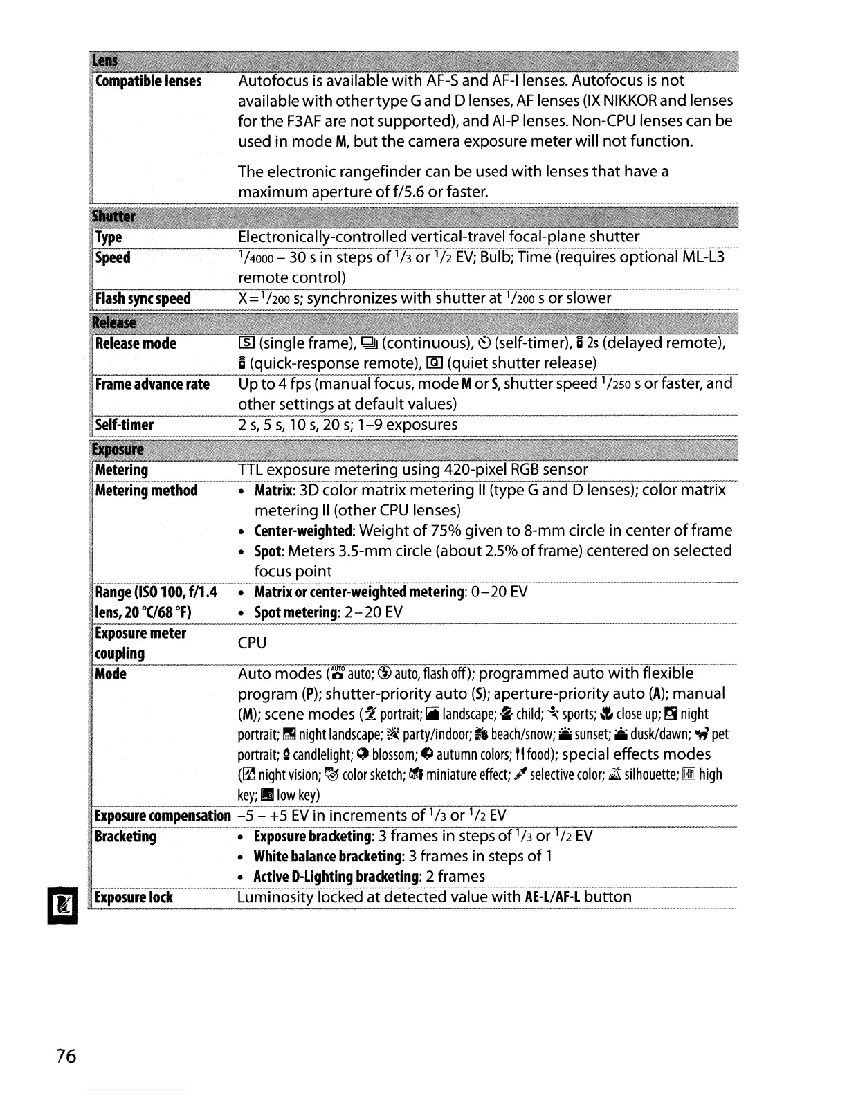 (continuous), ~ (self-timer), g
